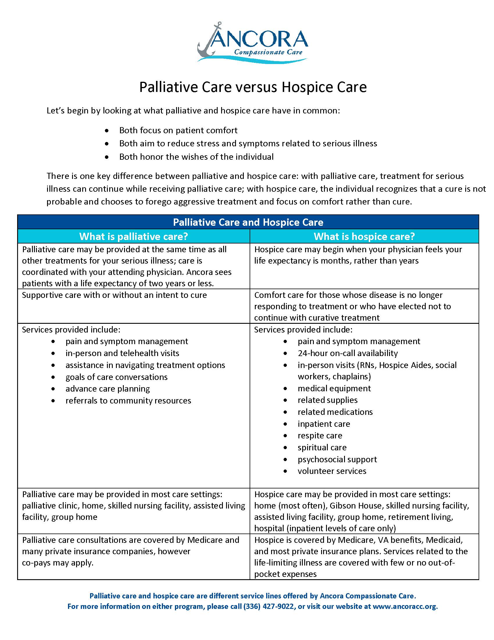 While our serious illness care program is a division of ANCORA Compassionate Care, serious illness care and hospice care are two different specialties. Unfortunately, palliative care and hospice have been used interchangeably in the medical community for years and thus, they are synonymous for many; we are trying to avoid confusion by referring to our program as Serious Illness Care.